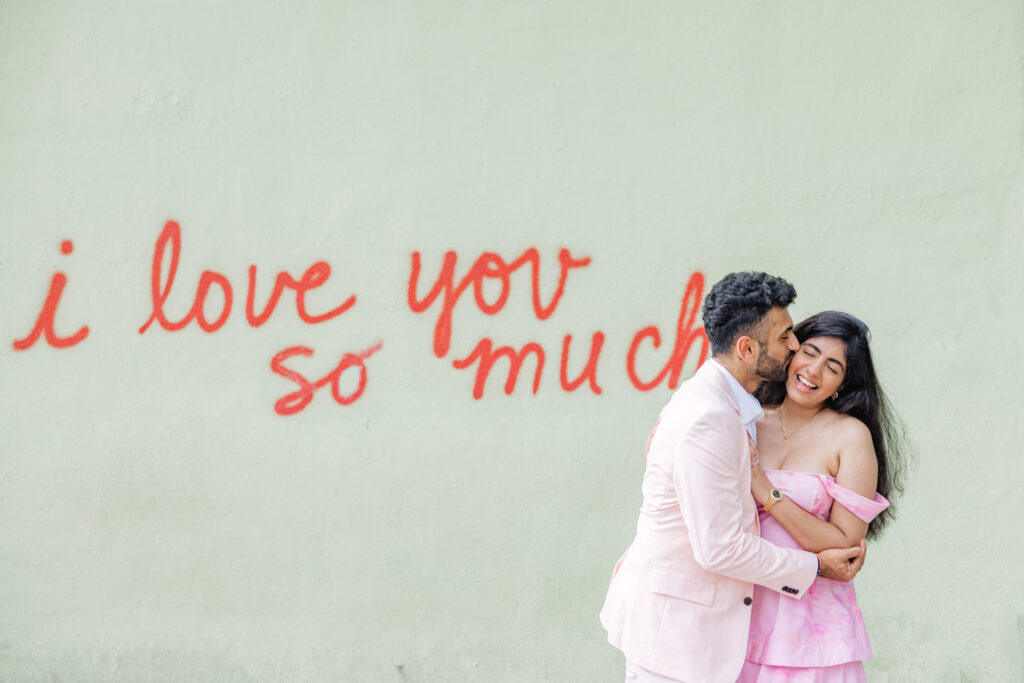 Harshit and Radhika leaned into a trending pink color palette, which photographed beautifully against the warm textures and pops of color along South Congress. Their outfits felt modern, romantic, and thoughtfully coordinated without being overly styled. What stood out most was how natural and joyful they were together. Elevated details like Louis Vuitton earrings and classic Chanel shoes added a subtle luxury touch that tied the entire look together.